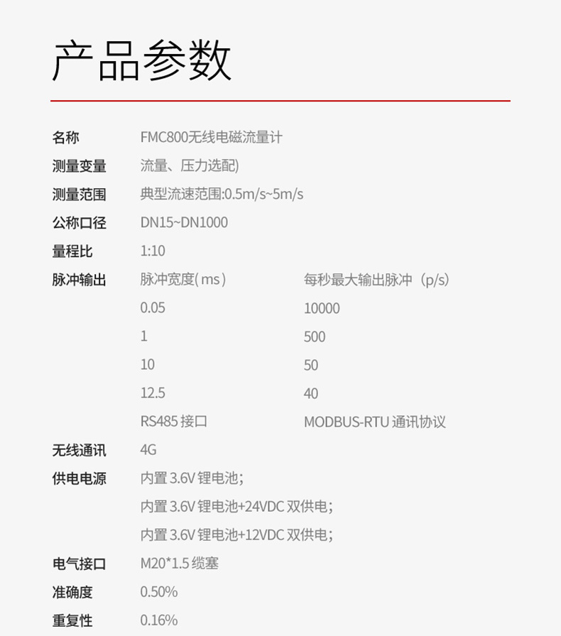 公海彩船6600_FMC800无线电磁流量计由电磁流量计和 4G 无线远传模块共同组成,用于测量封闭管道内导电液体的瞬时流量和累积流量。测量数据通过 4G 信号远传至网络接收平台,用户可以通过浏览器、微信公众号等方式灵活方便地查看数据、远程配置参数等功能,实现智能物联。广泛应用于自来水、化工、煤炭、环保、轻纺、冶金、造纸等行业。 流量转换器为电池供电型转换器,标配一个常规锂电池组,可持续工作 3~6 年。若配用高容量锂电池组,工作时间会更长。