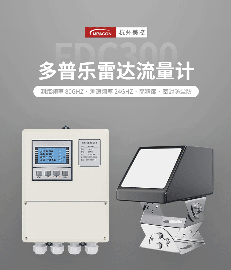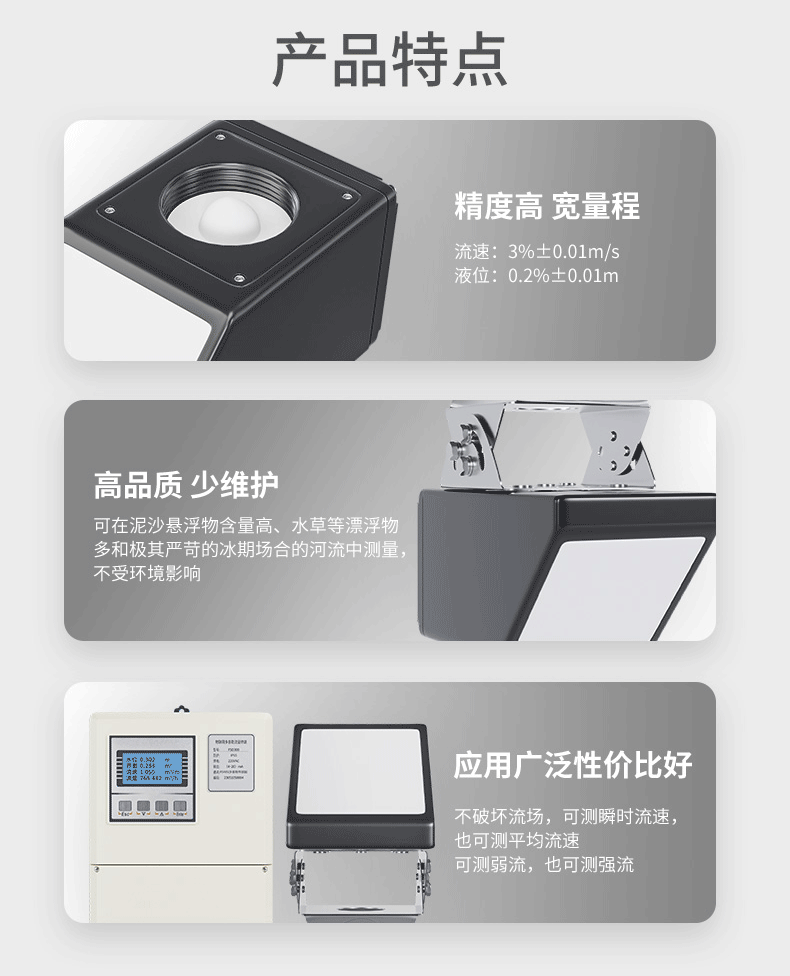 本产品是在自然水域中测量水的流速、水位的仪表。测距雷达单元工作频率为 80GHz,测速雷达单元工作频率为 24GHz。测量点在机体前方,不破坏流场,适用于泥沙悬浮物含量高、水草等漂浮物多和极其严苛的冰期场合的河流中测量。可广泛适用于水位测站、灌溉支渠、污雨水管网等流量监测。