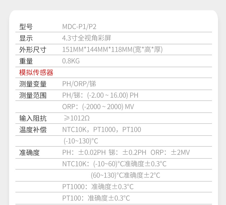 PH:±0.02PH锑:±0.2PHORP:±2MV NTC10K:(-10~60)C准确度± PT100:准确度±0.3C0.3C(60~130)℃准确度±2℃ PT1000:准确度±0.3℃